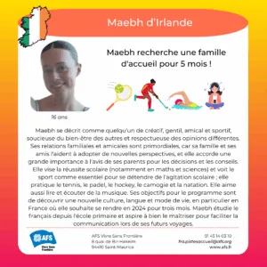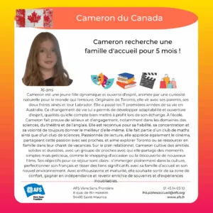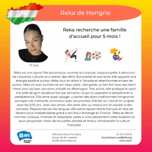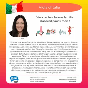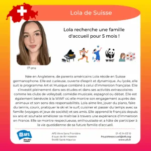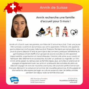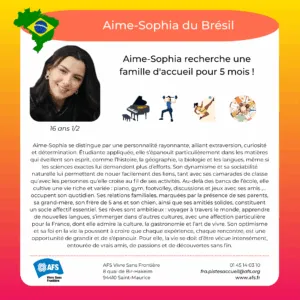 Vous pouvez également contacter Aurélie du Siège National d’AFS Vivre Sans Frontière à l’adresse e-mail [email protected] ou au 06 59 22 69 92.