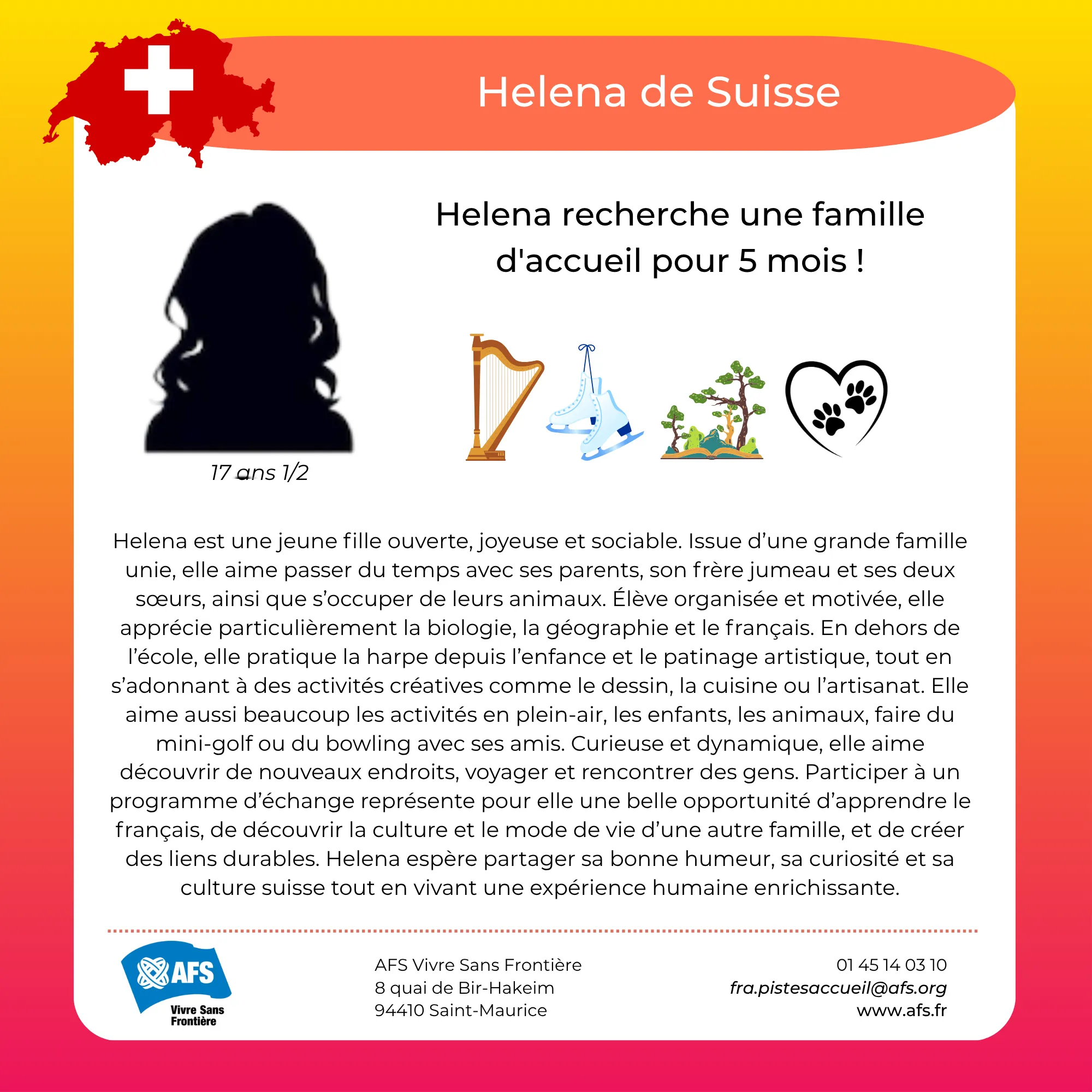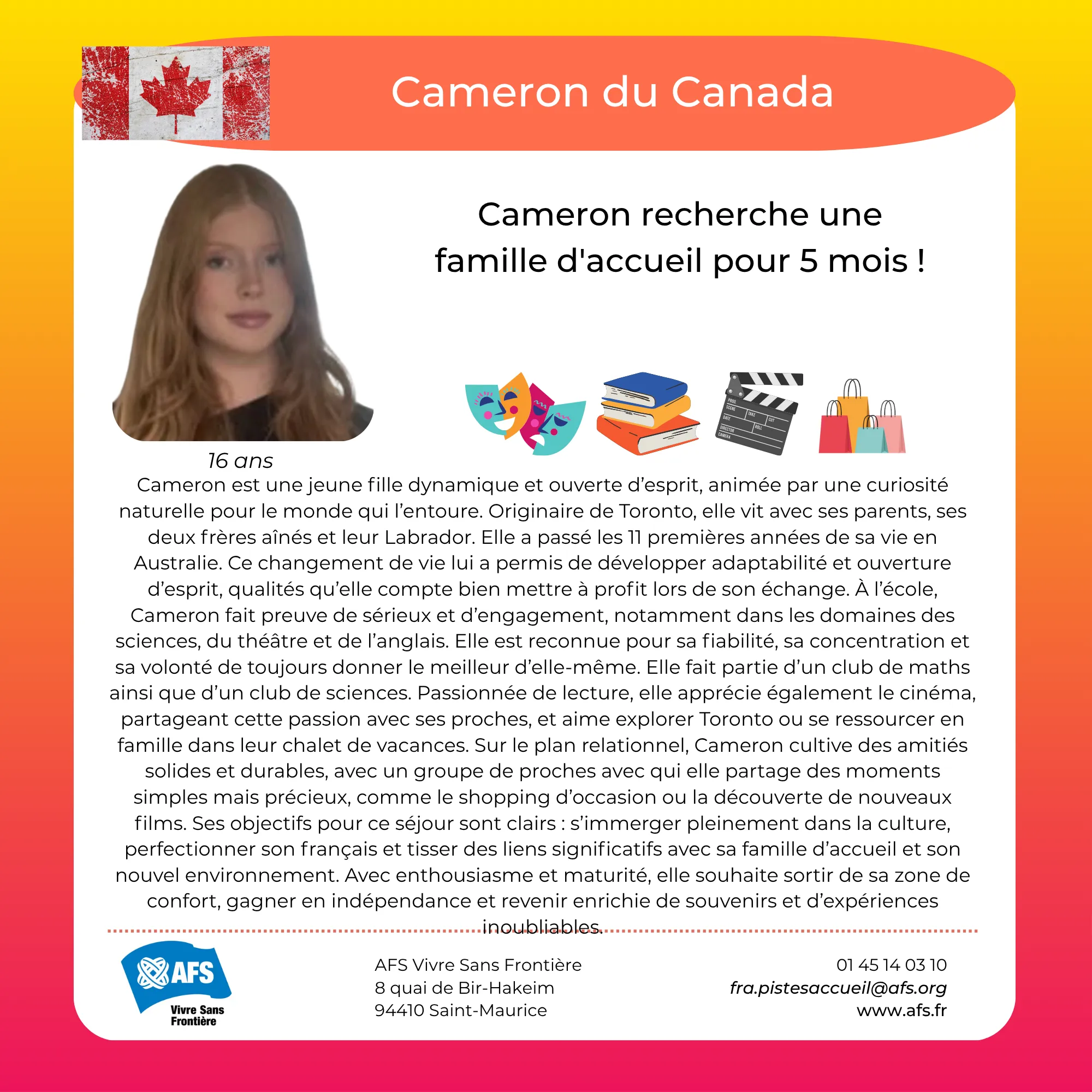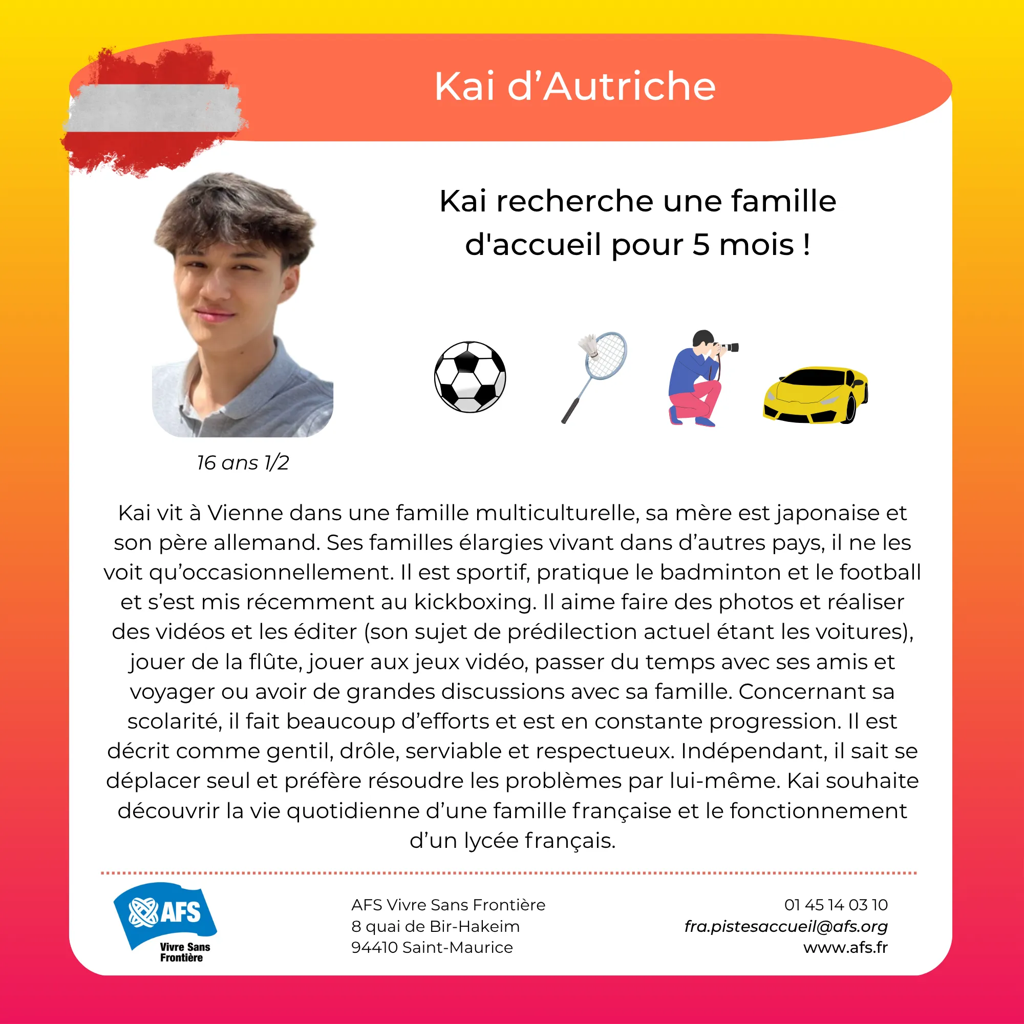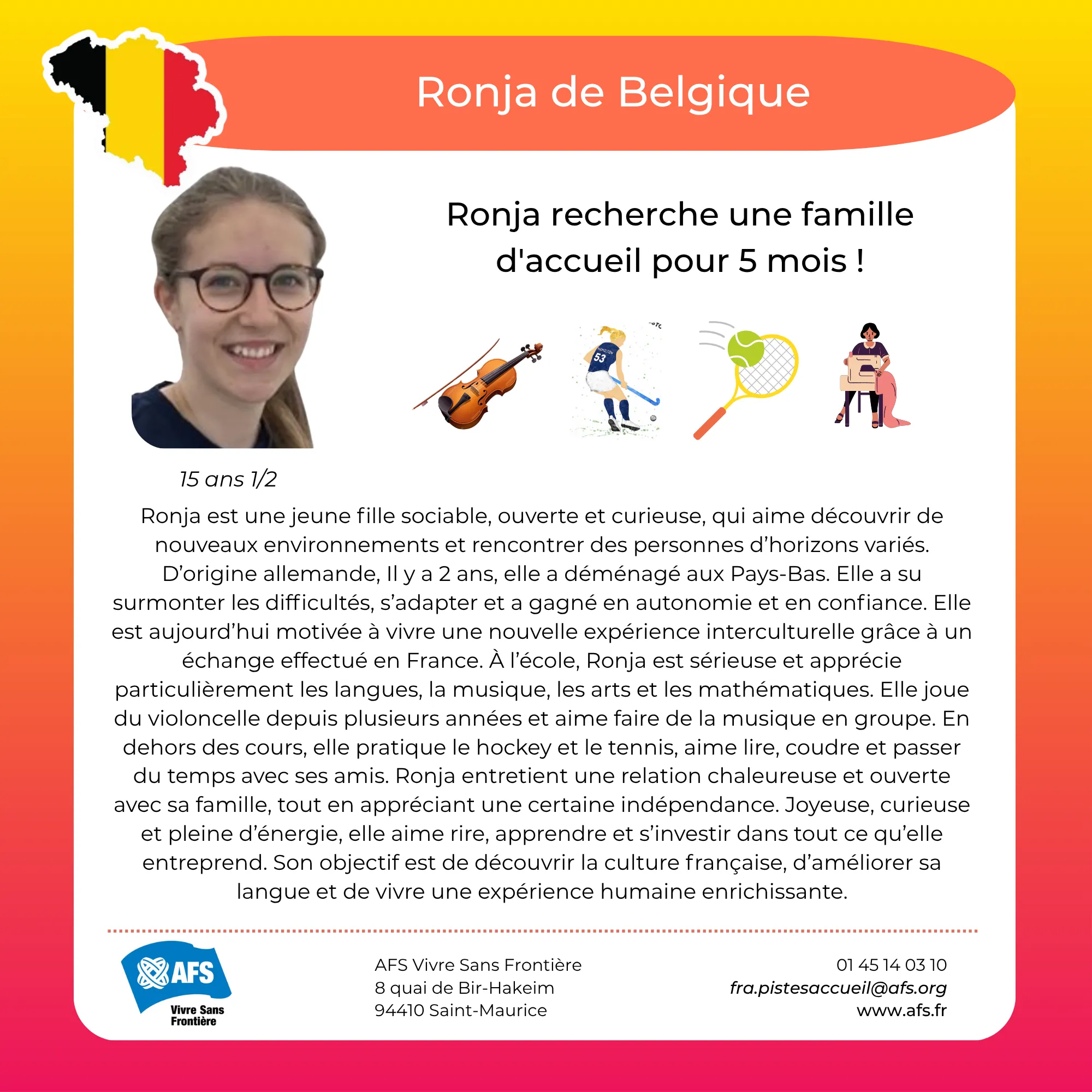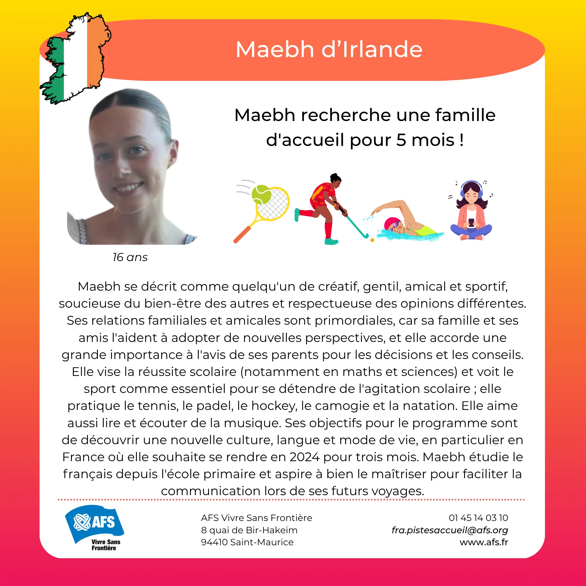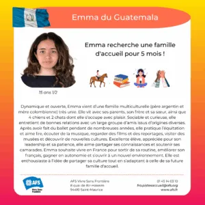 Vous pouvez également contacter Aurélie du Siège National d’AFS Vivre Sans Frontière à l’adresse e-mail [email protected] ou au 06 59 22 69 92.