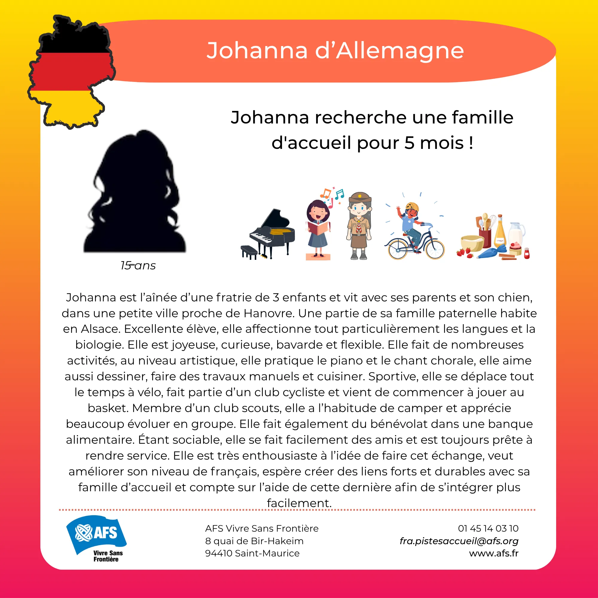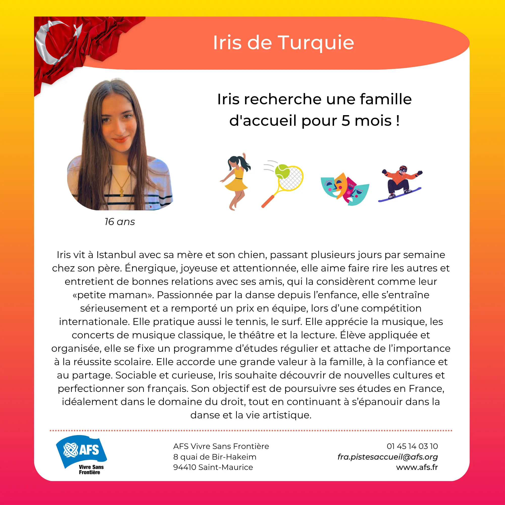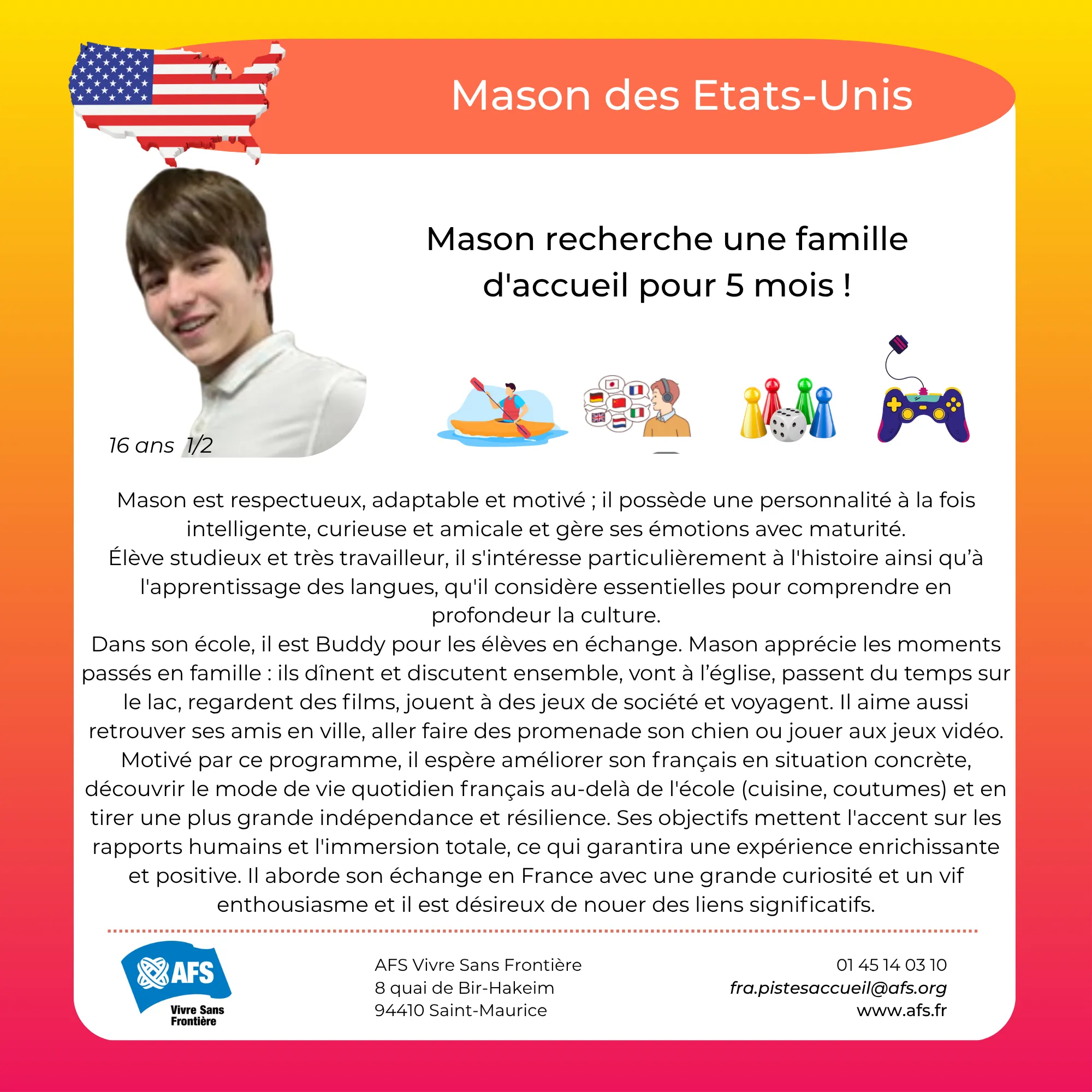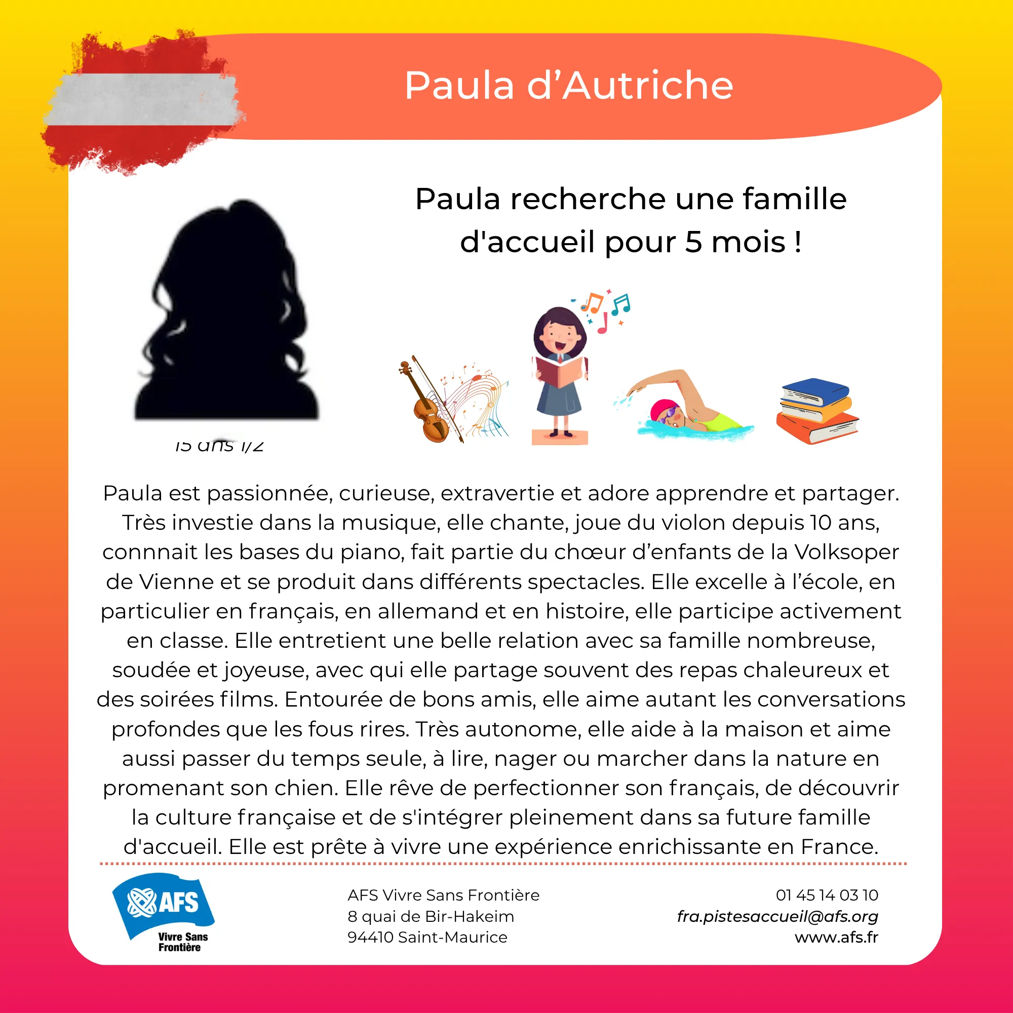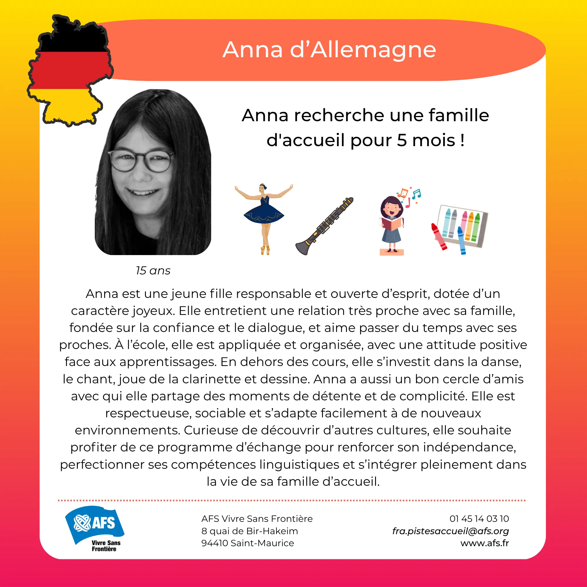 Vous pouvez également contacter Aurélie du Siège National d’AFS Vivre Sans Frontière à l’adresse e-mail [email protected] ou au 06 59 22 69 92.
