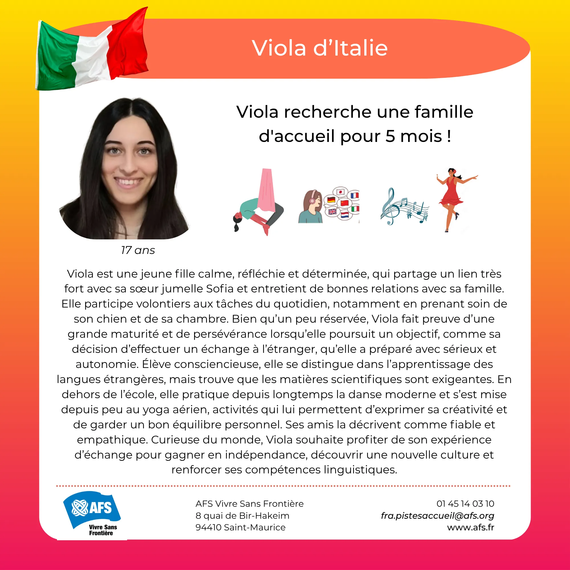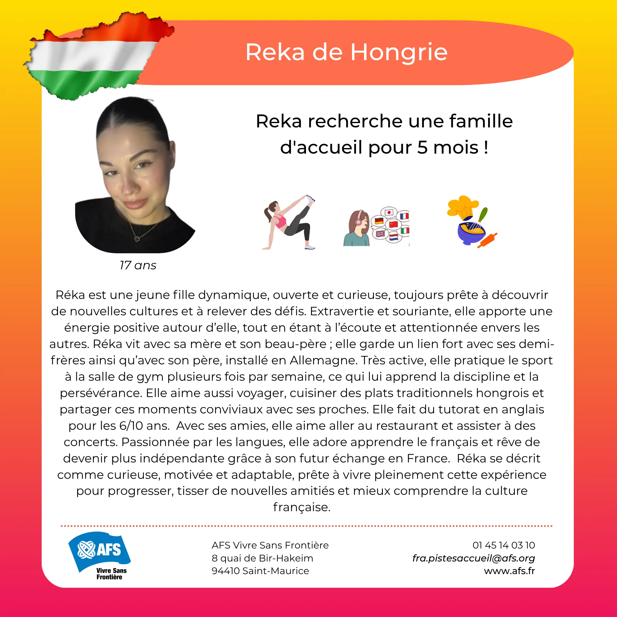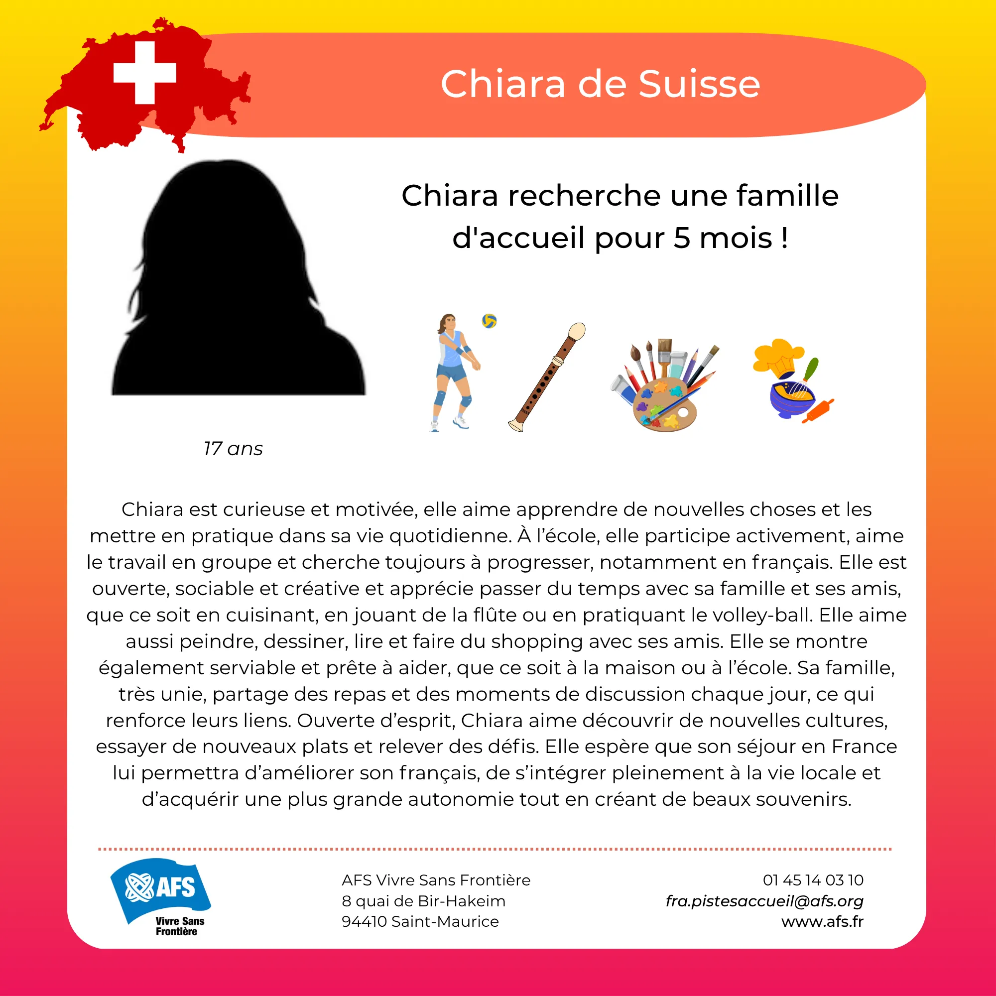 Vous pouvez également contacter Aurélie du Siège National d’AFS Vivre Sans Frontière à l’adresse e-mail [email protected] ou au 06 59 22 69 92.